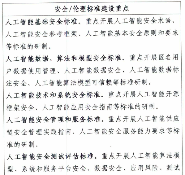 1.安全與隱私保護標準。包括基礎安全,數據、算法和模型安全,技術和系統安全,安全管理和服務,安全測試評估,產品和應用安全等六個部分。