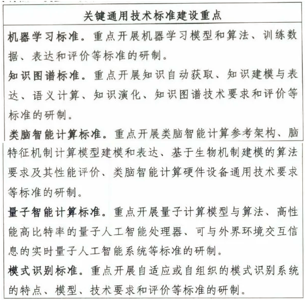 D關鍵通用技術標準主要圍繞機器學習、知識圖譜、類腦智能計算、量子智能計算、模式識別等方面,為人工智能應用提供通用技術支撐;