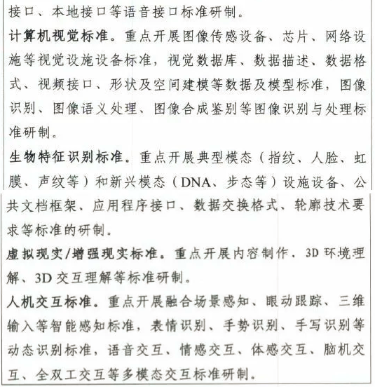 E關鍵領域技術標準主要圍繞自然語言處理、智能語音、計算機視覺、生物特征識別、虛擬現實/增強現實、人機交互等方面,為人工智能應用提供領域技術支撐;