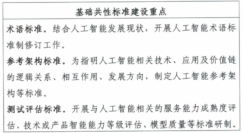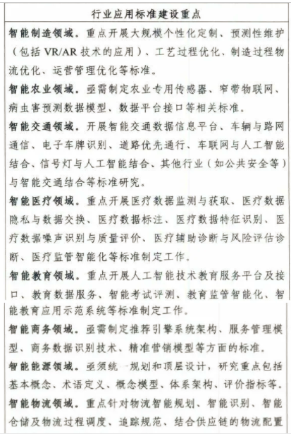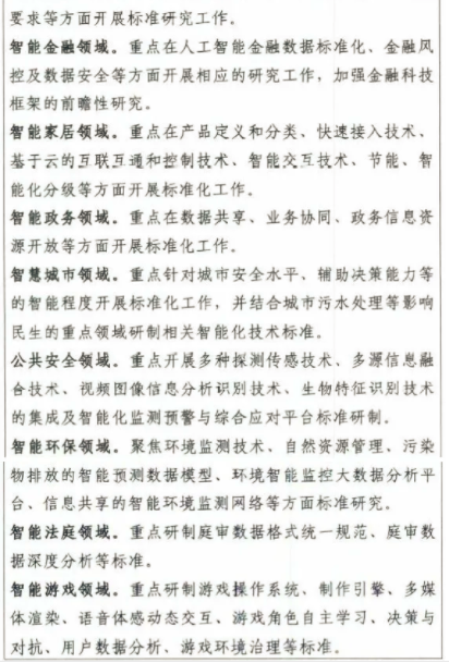 到2023年,初步建立人工智能標準體系,重點研制數據、算法、系統、服務等重點急需標準,并率先在制造、交通、金融、安防、家居、養老、環保、教育、醫療健康、司法等重點行業和領域進行推進。建設人工智能標準試驗驗證平臺,提供公共服務能力。