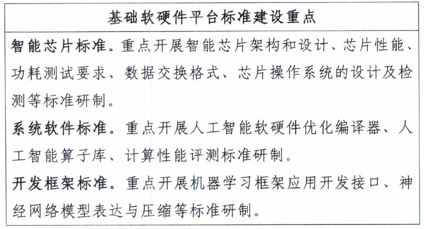 C基礎軟硬件平臺標準主要圍繞智能芯片、系統軟件、開發框架等方面,為人工智能提供基礎設施支撐;