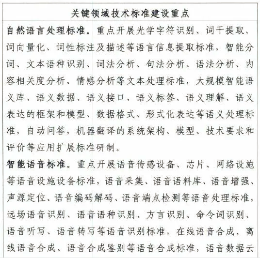 關鍵領域技術標準主要包括自然語言處理、智能語音、計算機視覺、生物特征識別、虛擬現實/增強現實、人機交互等部分,如圖7所示。