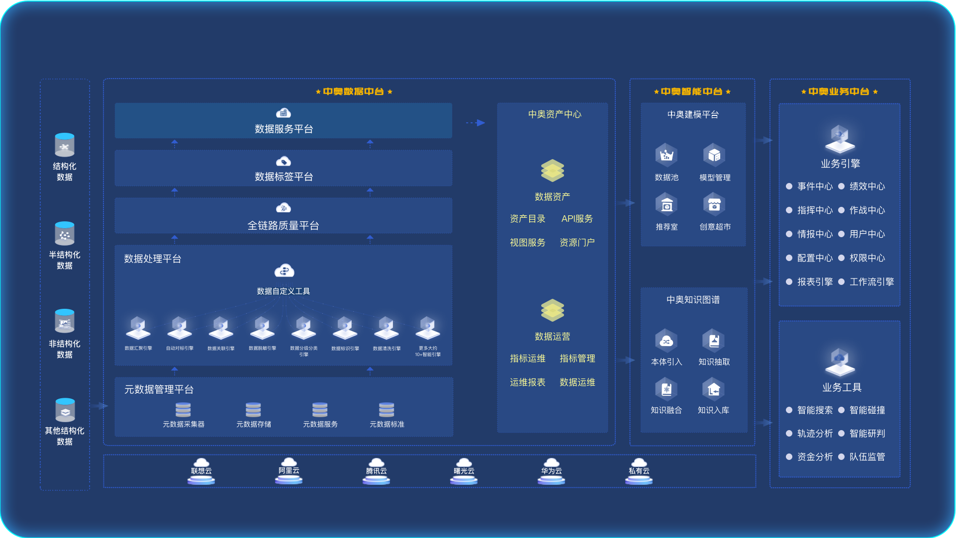 中奧經過多年政務行業經驗積累,依托于云計算、大數據和人工智能技術,沉淀了一套以“數據+智能+業務”三中臺為核心的完整技術架構體系,數據中臺解決了數據孤島、數據多源、重復開發等問題,把數據資源轉化為數據資產,為用戶支撐高效的數據服務;智能中臺集數據管理、算法管理、模型開發、方案構建于一體,為用戶挖掘數據價值、建設智能應用提供解決方案;業務中臺快速響應不同用戶多樣性應用需求,實現彈性“能力復用”。